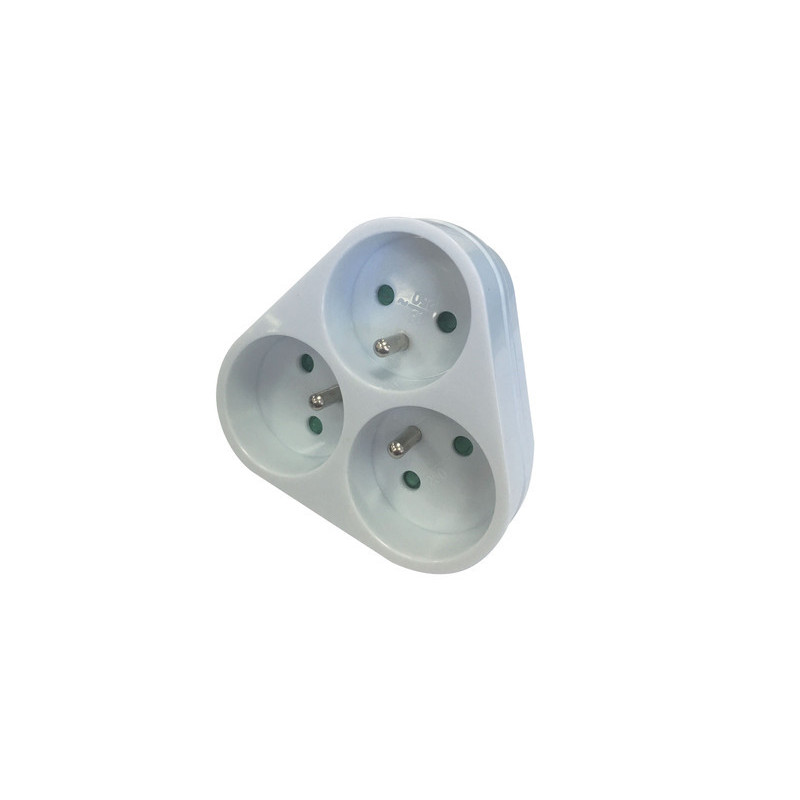 Plastique blanc. 3 prises 2 pôles 16A et une prise terre. . Forme triangulaire. A utiliser à l'intérieur.