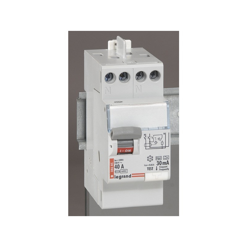 230 V. H 90 x L 50 x P 80 mm. Sensibilité 40 mA. 2 modules. Câble préconisé section 16 mm².