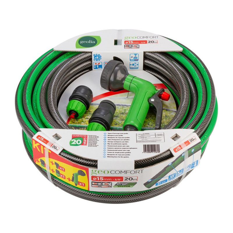 Comprend tuyau tricoté + raccords et embouts + pistolet 1 jet avec poignée stop. Dimensions : Ø 15mm longueur 20 m