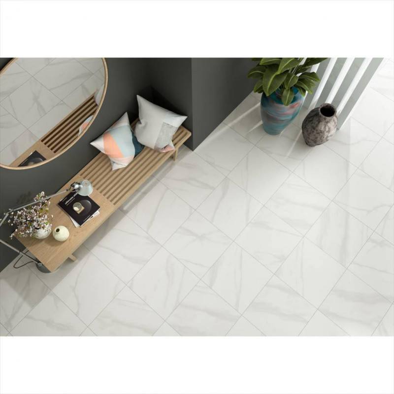 Grés cérame émaillé. Bords droits. Effet marbre coloris blanc. Finition lisse brillante. Pour pose en intérieur.