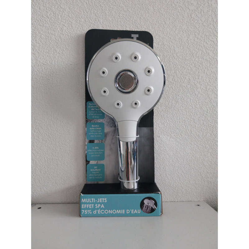 3 jets sélectionnables par bouton poussoir. Bouton auto clean (nettoyage anti calcaire des buses). Coloris chrome et blanc. Jet en colonne et brouillard.