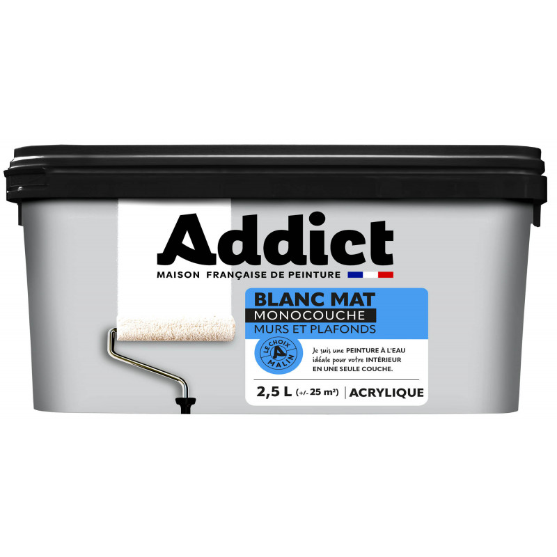 Pour murs et plafonds intérieurs. Peinture acrylique. Nettoyage des outils à l'eau. coloris blanc aspect mat. Couvre en une couche. Rendement +/-25m².