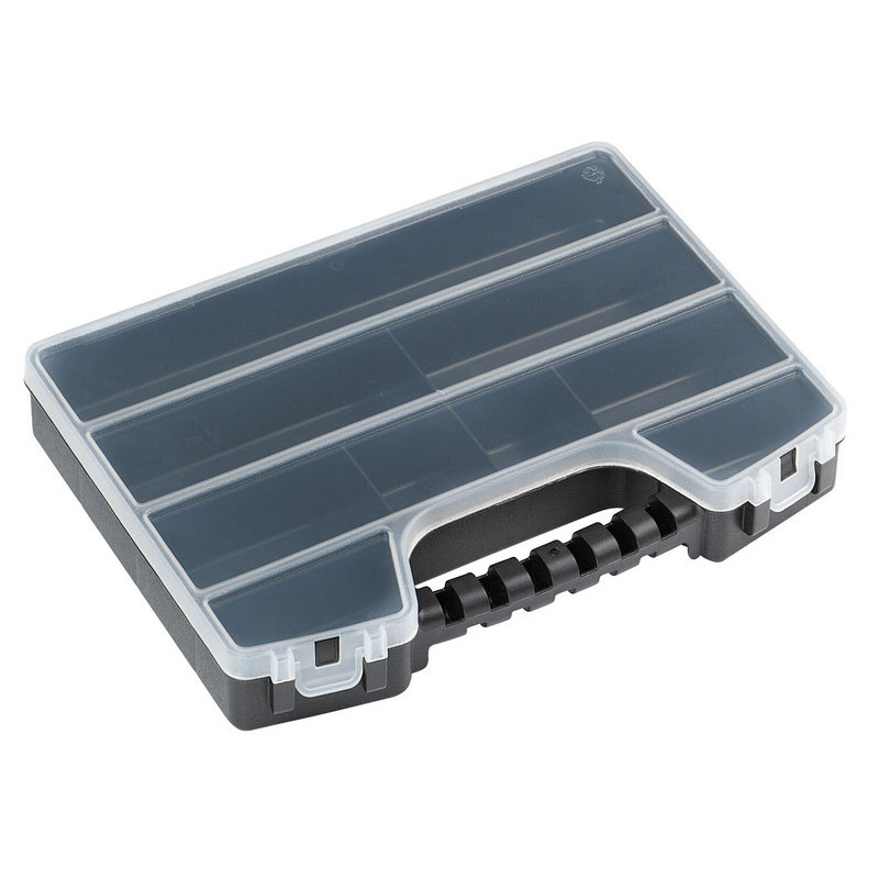 L 32.5 x H 5 x P 25 cm. En polypropylène. Double fermeture et poignée ergonomique. Coloris noir et transparent.