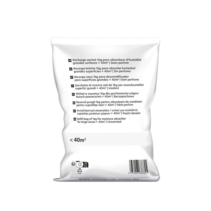 L.15 x l. 20 x H. 4.5 cm. Sac de pastilles 1kg recharge pour absorbeur d'humidité. Utilisable dans toutes les pièces jusqu’à 20m².