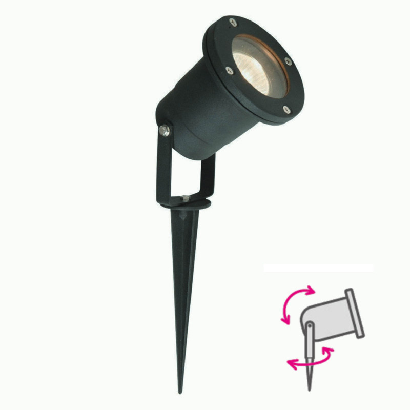 Projecteur extérieur à piquer. GU 10- 28W. En aluminium coloris noir. Tête rotative. IP65-Etanche.(Ampoule vendue séparément).