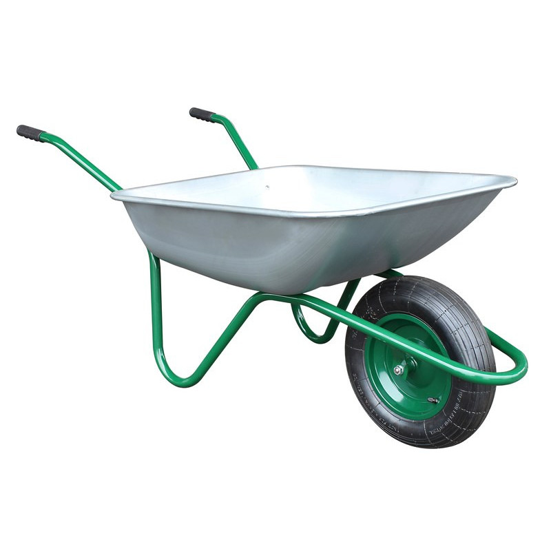 Brouette en acier galvanisé. Bords roulés avec renforts avant. Châssis monotubulaire. Pare choc avant. Roue gonflée Ø 25 cm. Capacité : 90 L