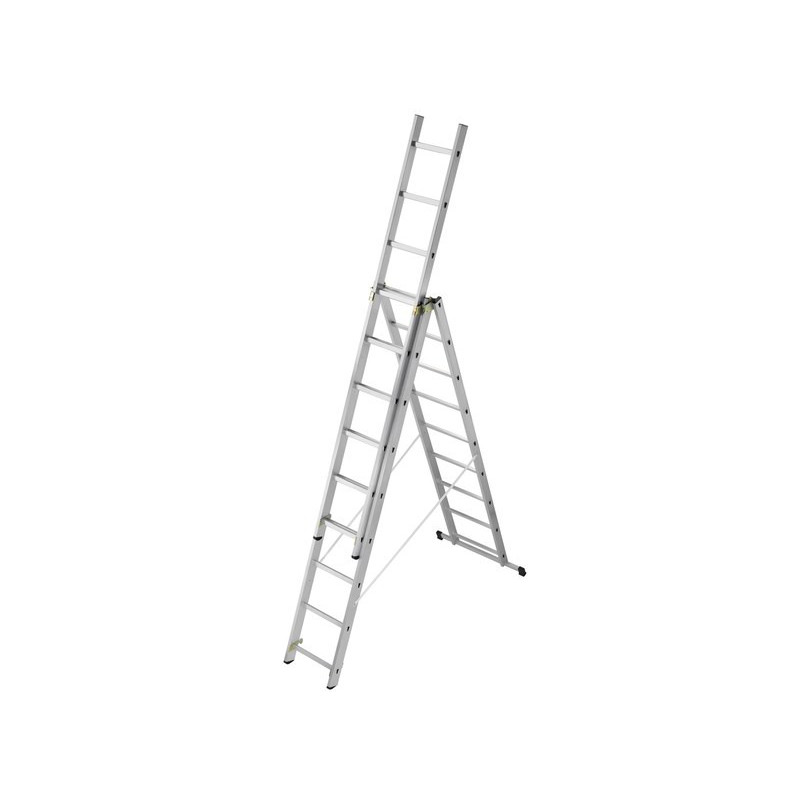 Pliée H 2.56 x l 0.46 m. Dépliée H 5.4 x l 0.46 m. Hauteur maximale de travail 6.23 m. 27 échelons. En aluminium.
