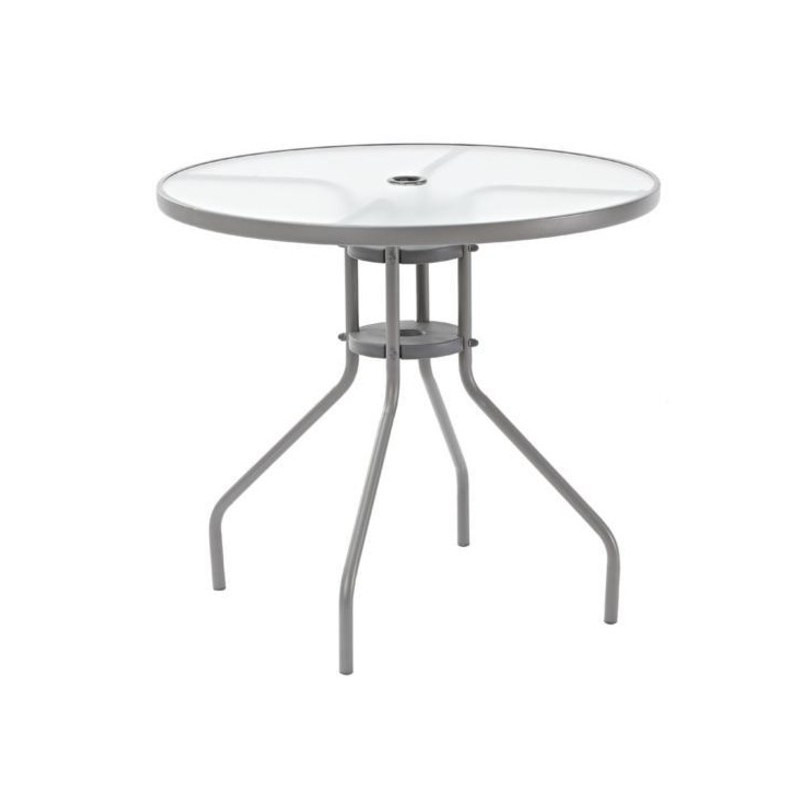 H 70 x Ø 80 cm. En acier et verre. Avec emplacement pour parasol. Coloris gris.