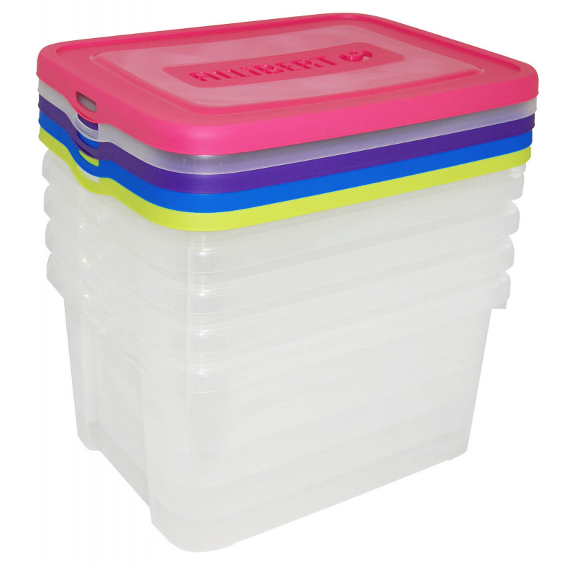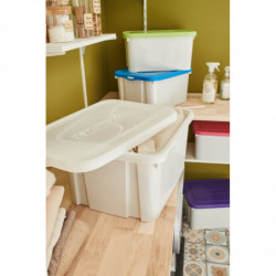 En plastique.25 L L.44.8 x P. 34.5 x H. 22.5cm. .Superposables. Avec couvercle coloris assortis